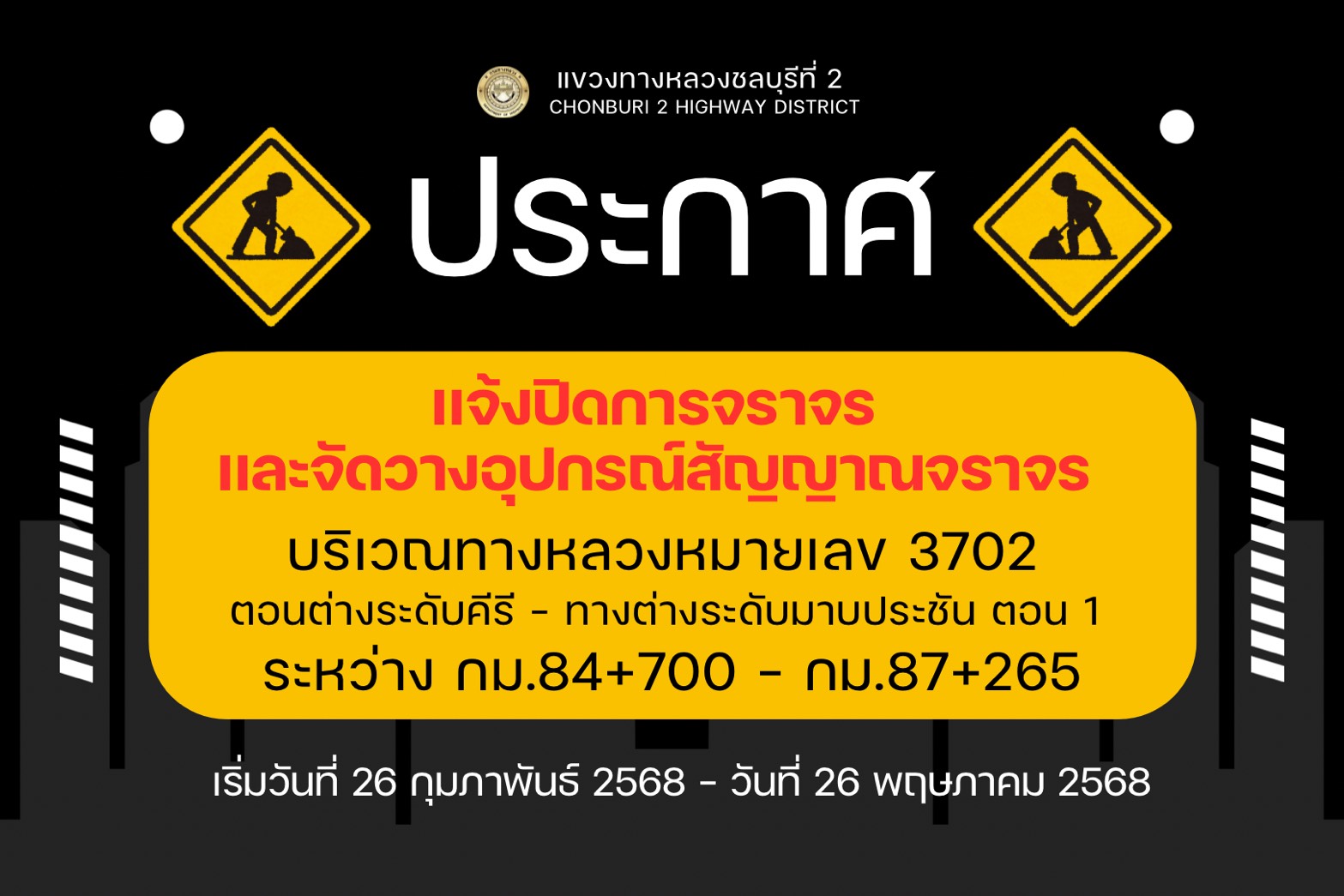 7 26/03/2568 แจ้งพื้นที่ก่อสร้างงานจ้างเหมา ทำการกิจกรรมบำรุงรักษาทางหลวง งานซ่อมทางผิวแอสฟัลต์ บริเวณทางหลวงหมายเลข 3702