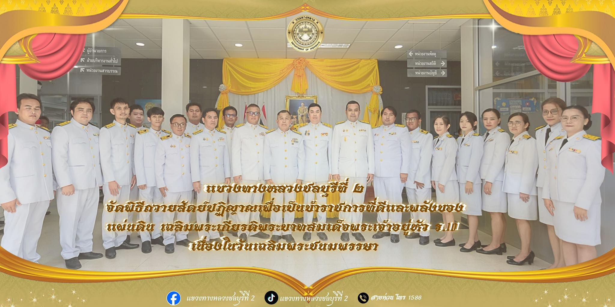 ในวันศุกร์ที่ 25 กรกฎาคม 2568 นายชาติพงษ์ รตโนภาส ผู้อำนวยการแขวงทางหลวงชลบุรีที่ 2 พร้อมด้วยข้าราชการ พนักงานราชการ ลูกจ้างประจำ และเจ้าหน้าที่ในสังกัดแขวงทางหลวงชลบุรีที่ 2 จัดพิธีถวายพระพรชัยมงคลและถวายสัตย์ปฏิญาณเพื่อเป็นข้าราชการที่ดีและพลังของแผ่นดิน เนื่องในโอกาสวันเฉลิมพระชนมพรรษา พระบาทสมเด็จพระปรเมนทรรามาธิบดีศรีสินทรมหาวชิราลงกรณ พระวชิรเกล้าเจ้าอยู่หัว 28 กรกฎาคม 2568 พร้อมทั้งลงนามถวายพระพร ขอพระองค์ทรงพระเจริญยิ่งยืนนาน